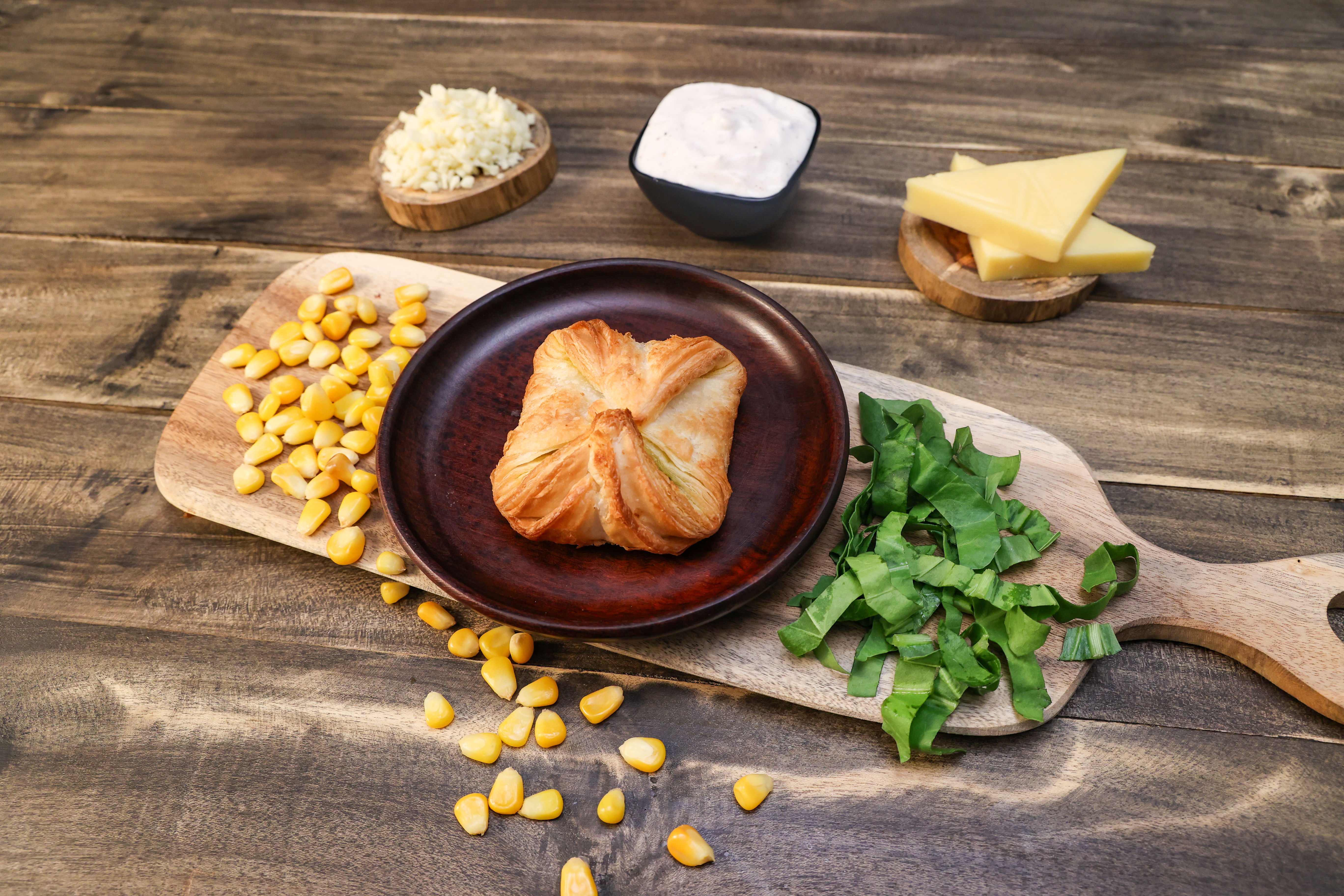 Parcel shaped puff pastry with spinach and shelled corn fillings with a burst of cheese in every bite.