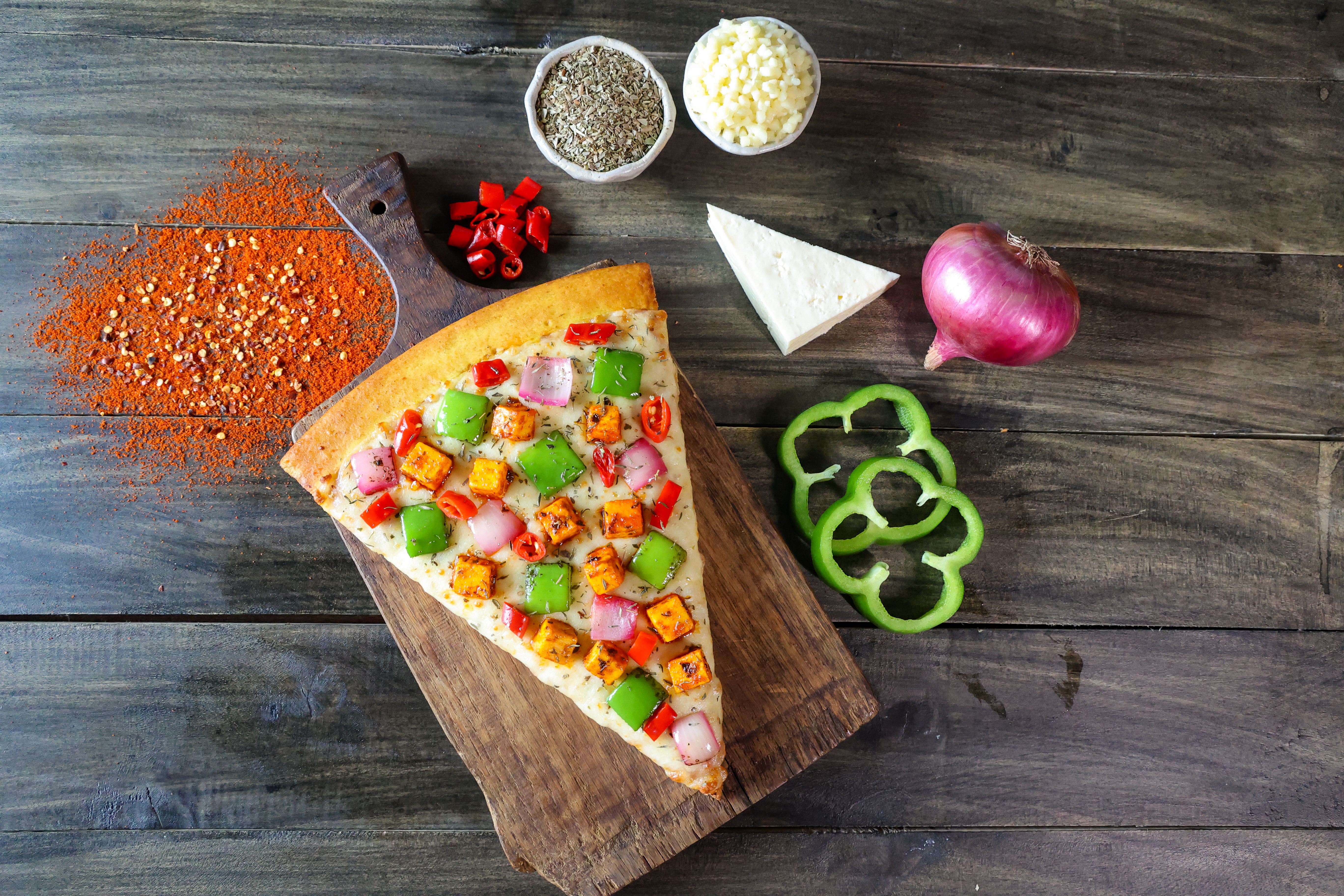 A delectable blend of Italian and Indian flavors, on an Italian sourdough base, featuring zesty pizza sauce, melted mozzarella cheese, and a flavorful trio of juicy paneer, crisp capsicum with spicy red paprika.